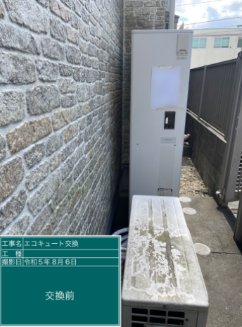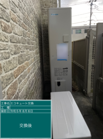 交換したダイキン EQX46XFTVは、「フルオート 無線LAN対応リモコン(要Wi-Fi環境) パワフル高圧給湯 気象警報緊急沸き上げ 自動配管洗浄 昼間シフト機能・昼間シフト天気予報連動」の機能が特徴の薄型・フルオートのエコキュートで、タンク容量は460L、圧力はパワフル高圧となっています。