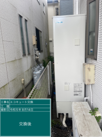 交換したダイキン EQX46XFVは、「フルオート 無線LAN対応リモコン(要Wi-Fi環境) パワフル高圧給湯 おゆぴかUV 気象警報緊急沸き上げ 自動配管洗浄 昼間シフト機能・昼間シフト天気予報連動」の機能が特徴の角型・フルオートのエコキュートで、タンク容量は460L、圧力はパワフル高圧となっています。