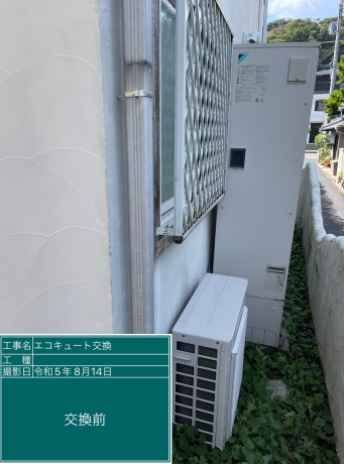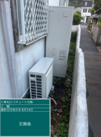 交換したダイキン EQX37XFVは、「フルオート 無線LAN対応リモコン(要Wi-Fi環境) パワフル高圧給湯 おゆぴかUV 気象警報緊急沸き上げ 自動配管洗浄 昼間シフト機能・昼間シフト天気予報連動」の機能が特徴の角型・フルオートのエコキュートで、タンク容量は370L、圧力はパワフル高圧となっています。