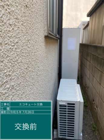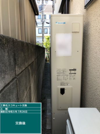 交換したダイキン EQX37XFTVは、「フルオート 無線LAN対応リモコン(要Wi-Fi環境) パワフル高圧給湯 気象警報緊急沸き上げ 自動配管洗浄 昼間シフト機能・昼間シフト天気予報連動」の機能が特徴の薄型・フルオートのエコキュートで、タンク容量は370L、圧力はパワフル高圧 となっています。