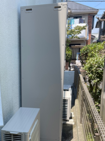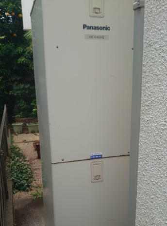 交換した三菱 SRT-S466Uは、「フルオート 高圧パワフルモデル」の機能が特徴の角型・フルオートのエコキュートで、タンク容量は460L、圧力はハイパワー高圧となっています。