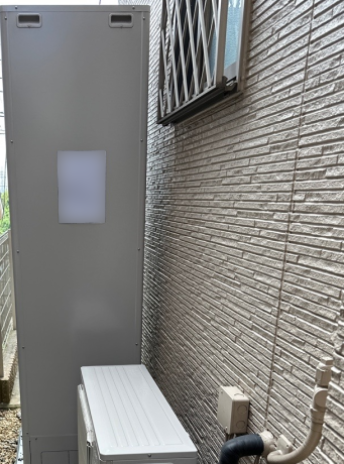 交換した三菱 SRT-S466Uは、「フルオート 高圧パワフルモデル」の機能が特徴の角型・フルオートのエコキュートで、タンク容量は460L、圧力はハイパワー高圧となっています。