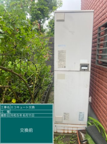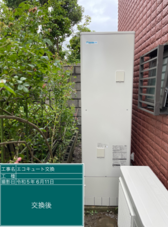 交換したダイキン EQX46XFVは、「フルオート 無線LAN対応リモコン(要Wi-Fi環境) パワフル高圧給湯 おゆぴかUV 気象警報緊急沸き上げ 自動配管洗浄 昼間シフト機能・昼間シフト天気予報連動」の機能が特徴の角型・フルオートのエコキュートで、タンク容量は460L、圧力はパワフル高圧となっています。