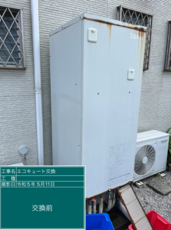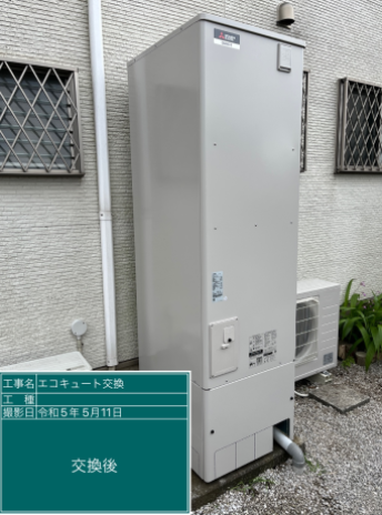 交換した三菱 SRT-W465は、「フルオート」の機能が特徴の角型・フルオートのエコキュートで、タンク容量は460、圧力は標準圧となっています。