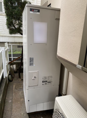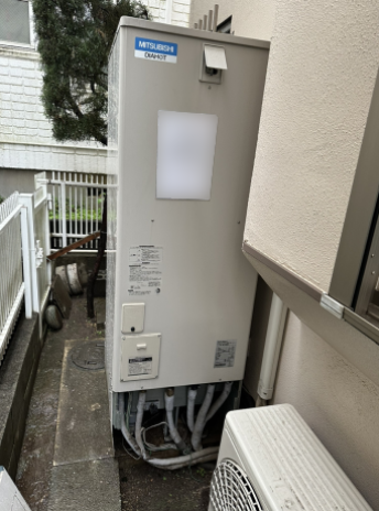 交換した三菱 SRT-S375Uは、「フルオート 高圧パワフルモデル」の機能が特徴の角型・フルオートのエコキュートで、タンク容量は370L、圧力はハイパワー高圧給湯となっています。