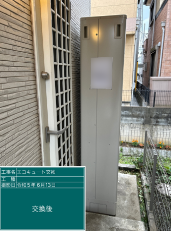交換したダイキン EQX46XFTVは、「フルオート 無線LAN対応リモコン(要Wi-Fi環境) パワフル高圧給湯 気象警報緊急沸き上げ 自動配管洗浄 昼間シフト機能・昼間シフト天気予報連動」の機能が特徴の薄型・フルオートのエコキュートで、タンク容量は370L、圧力はパワフル高圧となっています。