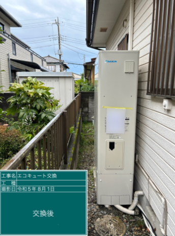 交換したダイキン EQX37XFTVは、「フルオート 無線LAN対応リモコン(要Wi-Fi環境) パワフル高圧給湯 気象警報緊急沸き上げ 自動配管洗浄 昼間シフト機能・昼間シフト天気予報連動」の機能が特徴の薄型・フルオートのエコキュートで、タンク容量は370L、圧力はパワフル高圧となっています。