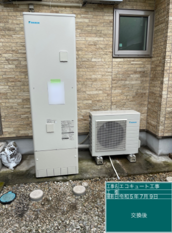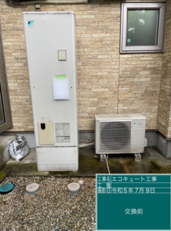 交換したダイキン EQX46XFVは、「フルオート 無線LAN対応リモコン(要Wi-Fi環境) パワフル高圧給湯 おゆぴかUV 気象警報緊急沸き上げ 自動配管洗浄 昼間シフト機能・昼間シフト天気予報連動」の機能が特徴の角型・フルオートのエコキュートで、タンク容量は460L、圧力はパワフル高圧 となっています。