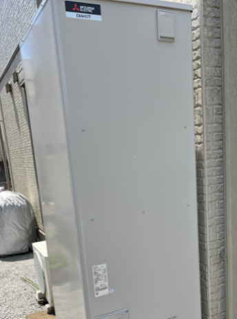 交換した三菱 SRT-S466Uは、「フルオート 高圧パワフルモデル」の機能が特徴の角型・フルオートのエコキュートで、タンク容量は460L、圧力はハイパワー高圧となっています。