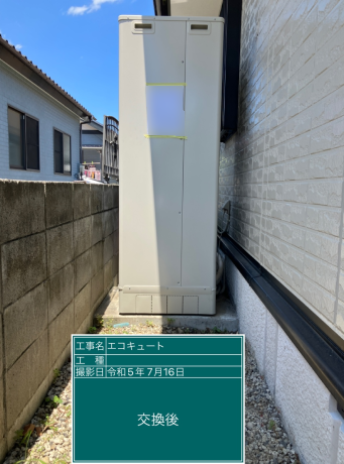 交換したダイキン EQN37XFVは、「フルオート 無線LAN対応リモコン(要Wi-Fi環境) 気象警報緊急沸き上げ 自動配管洗浄 昼間シフト機能・昼間シフト天気予報連動」の機能が特徴の角型・フルオートのエコキュートで、タンク容量は370L、圧力は標準圧 となっています。