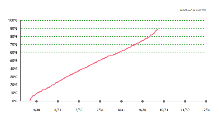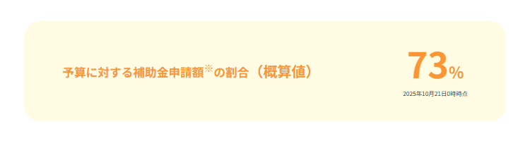 経済産業省が発表している「給湯省エネ2025事業」の予算に対する補助金申請額(交付申請および交付申請の予約が提出された総額)の割合は、2025年10月21日現在で上限の73%に達しています。予算の総額は580億円(令和6年度補正予算)で、補助金申請額が上限に達し次第、交付申請の受付は終了されます。