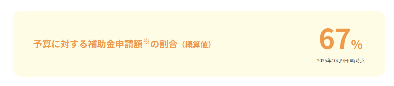 経済産業省が発表している「給湯省エネ2025事業」の予算に対する補助金申請額(交付申請および交付申請の予約が提出された総額)の割合は、2025年10月9日現在で上限の67%に達しています。予算の総額は580億円(令和6年度補正予算)で、補助金申請額が上限に達し次第、交付申請の受付は終了されます。