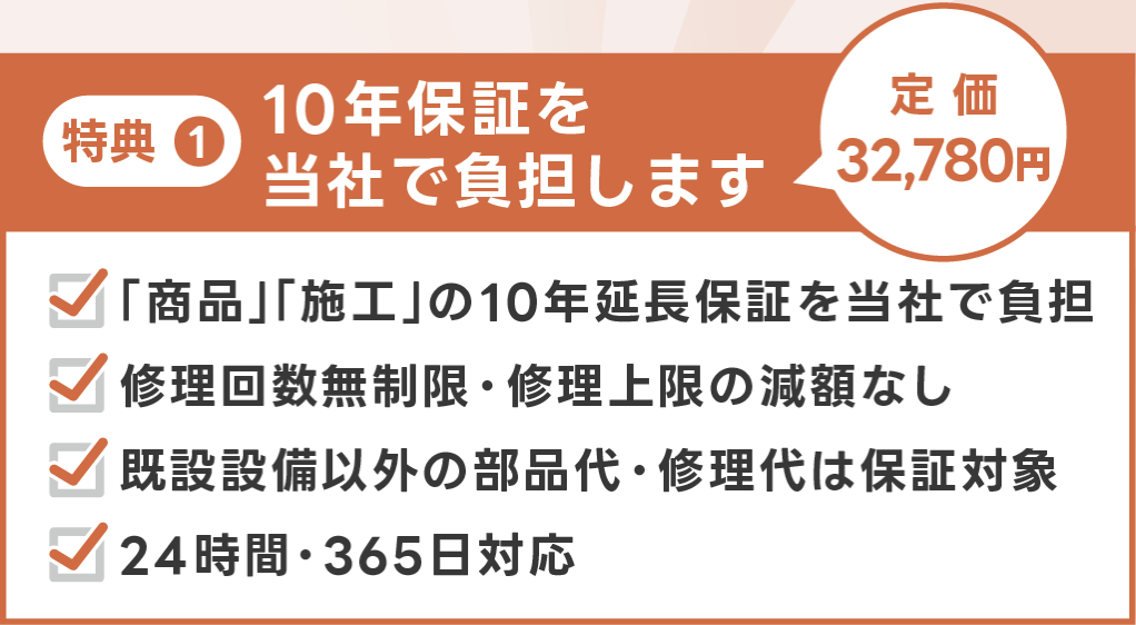 交換後も長く安心してエコキュートをお使いいただくため、当社では交換後の保証として「10年延長保証」をご用意しています。基本的に保証期間が1~2年ほどであるメーカー本体保証を10年間に延長し、既設設備以外の修理部品代や工事費は無料で対応。業界最高水準の保証内容でお客様を手厚くサポートします。