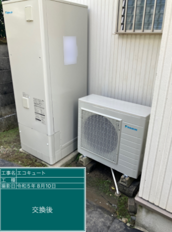 交換したダイキン EQX37XFVは、「フルオート 無線LAN対応リモコン(要Wi-Fi環境) パワフル高圧給湯 おゆぴかUV 気象警報緊急沸き上げ 自動配管洗浄 昼間シフト機能・昼間シフト天気予報連動」の機能が特徴の角型・フルオート のエコキュートで、タンク容量は370L、圧力はパワフル高圧 となっています。
