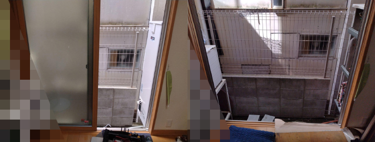 今回交換するのは、省スペースへの設置が可能な薄型タイプのエコキュート。作業しやすいように引き戸の窓を2枚とも外して作業を行います。