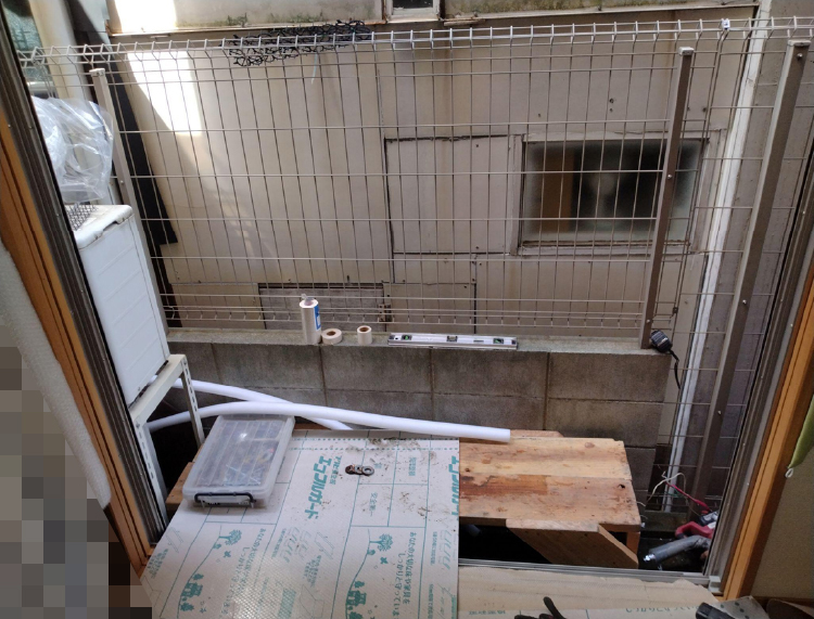 エコキュートが設置されているのは家屋裏の細い通路です。敷地内の通路はどこも狭く、家屋周りを通ってタンクを搬入することはできません。そのため今回は、設置場所に面した部屋の窓から既設のタンクを運び出し、宅内を通ってタンクの搬出入を行います。さらに宅内との高低差があるのを考慮して窓の前に足場を作成し、その上にタンクを持ち上げ安定させてから部屋の中へと運び入れます。