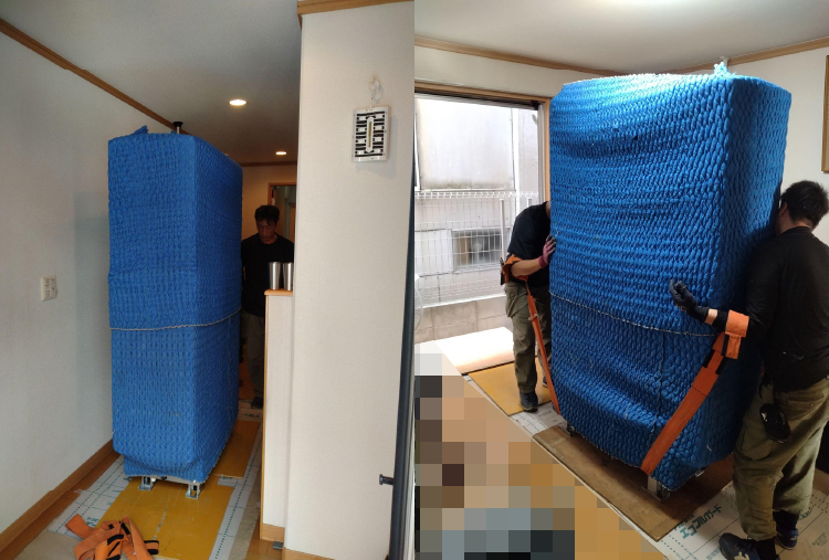 続いて養生マットで保護した新しいエコキュートを搬入します。運搬用のベルトを用いてゆっくり慎重に運び込んでいきます。