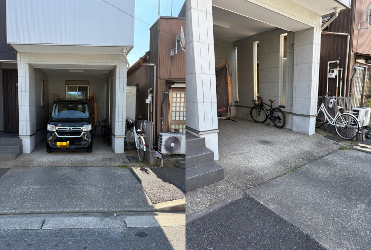 家屋周りや車庫スペースからは搬入経路が確保できないものの、正面の搬入口も雨樋が障害物となっており、このままではタンクを運び出すことができません。そこで今回はお隣の家主様に許可を頂いて、入口付近のフェンスを外してタンクの搬出入を行うことになりました。
