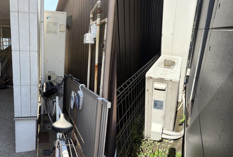 エコキュートは、家屋脇の通路の入口付近に設置されていました。薄型のタンクがギリギリ収まる程の幅しかない狭い通路で、隣家との間にはフェンスが設けられています。ヒートポンプがあるのはタンクの裏側です。
