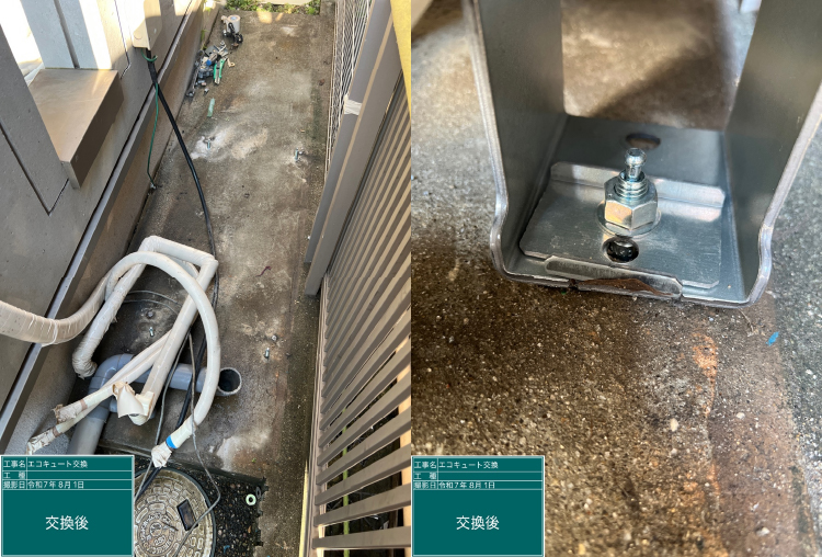 まずはタンクの水抜きなど下処理を行ってから既設のタンクとヒートポンプを運び出します。基礎や配管に問題がないかどうか確認し、新しいタンクの脚位置にアンカーボルトを打ち込みます。