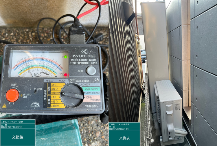 続いて新しいエコキュートのタンクとヒートポンプを運び入れて、それぞれに配管や配線を繋ぎ合わせます。