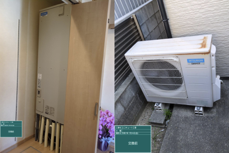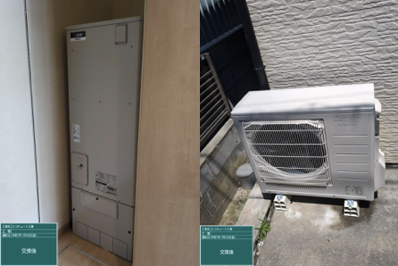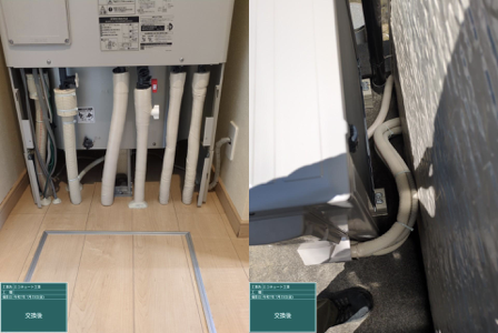 続いて新しいタンクとヒートポンプを運び入れて、それぞれに配管や配線を繋ぎ合わせます。配管まわりのすき間はコーキング剤で塞いで、ゴミや害虫の侵入防止対策を施しました。