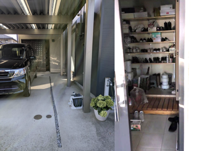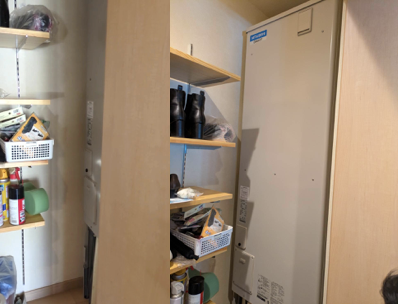 玄関扉を開けたすぐ正面に靴棚があり、その右奥にある狭いスペースの幅ギリギリに既設のタンクが収まっていました。タンクを搬出入する際に靴棚が障害物となるため、棚は一旦すべて取り外して玄関からの搬入経路を確保します。
