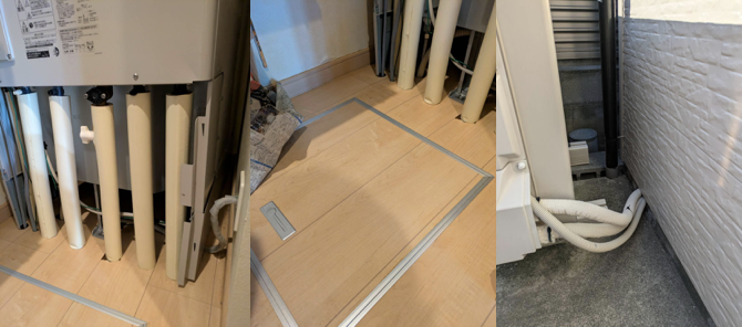 タンクから伸びる配管は床を貫通させて外のヒートポンプと繋がれていました。そのため今回は、床下を開けて配管の交換作業を行いタンクとヒートポンプを繋ぎます。