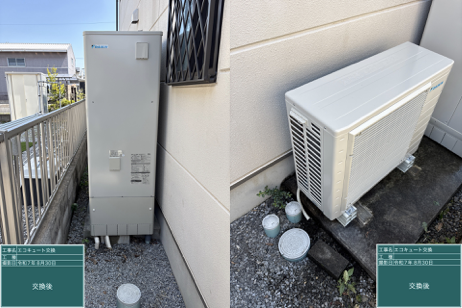 エコキュート交換工事の様子や、それにまつわるトラブル事例を紹介するこのコーナー。今回紹介するのは、滋賀県東近江市にお住まいのN様邸で行った交換工事の様子。約15年間使用したセミオートタイプのエコキュートが故障し、同じセミオートタイプの新しいエコキュートに交換しました。