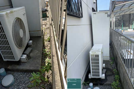 続いて新しいエコキュートのタンクとヒートポンプを運び入れて、それぞれに配管や配線を繋ぎ合わせます。