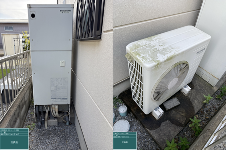 今回交換工事に訪れたのは、滋賀県東近江市。県の南東部に位置する市で、ブランド牛で知られる「近江牛」の産地です。日本海や太平洋、山脈に囲まれた地形の影響から、市内各所でそれぞれ異なる気候区分に属しているのも特徴です。交換工事のご依頼を頂いたN様のご自宅は、正面に広い駐車スペースのある大きな一軒家。エコキュートが設置されているのは家屋の裏側です。