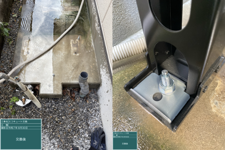 まずはタンクの水抜きなど下処理を行ってから、既設のエコキュートを運び出します。基礎や配管を確認して問題がなければ、新しいタンクの脚位置に合わせてアンカーボルトを打ち込みます。