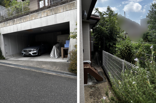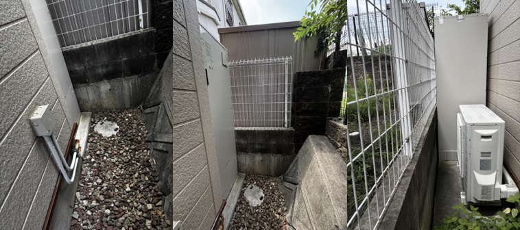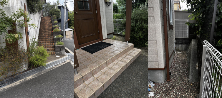 1階部分はガレージで、建物の脇にある長い階段を上った先に玄関があります。エコキュートは家屋の裏側に設置されているため、玄関脇の通路から裏へとまわります。