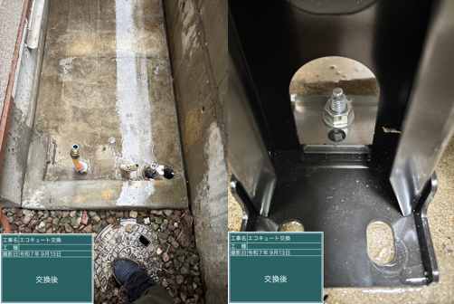 タンクの水抜きなど下処理を行ってから既設のエコキュートを運び出します。基礎や配管に問題がないかどうか確認し、新しいタンクの脚位置に合わせてアンカーボルトを打ち込みます。