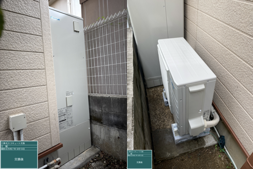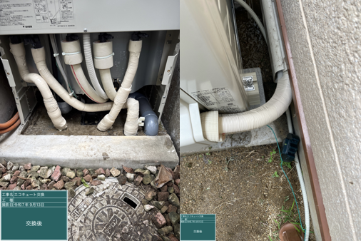エコキュート交換工事の様子や、それにまつわるトラブル事例を紹介するこのコーナー。今回紹介するのは、大阪府池田市にお住まいのE様邸で行った交換工事の様子。20段を超える長い階段を昇り降りして、タンクの搬出入を行いました。セミオートタイプのエコキュートから同じセミオートタイプに交換しています。