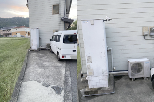 今回交換工事に訪れたのは、佐賀県伊万里市。佐賀県西部に位置し、穏やかな気候と海や山に囲まれた自然豊かな環境が特徴のエリアです。伊万里焼の産地としても知られています。交換工事のご依頼を頂いたE様のご自宅は、道路沿いに建つ広い間口の一軒家。家屋の裏には空き地が広がっています。エコキュートの設置場所は、車庫がある家屋脇のスペースです。