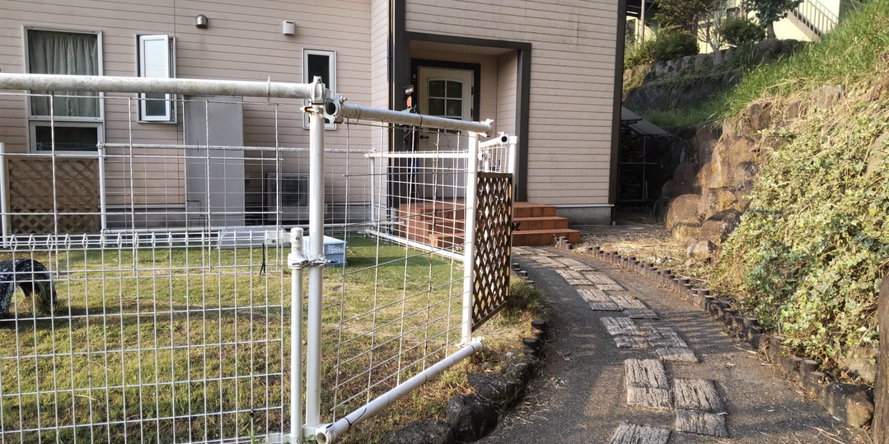 駐車スペースから8段程の階段を上がると、柵で囲われた広い庭があります。家屋があるのはその奥で、庭に沿ってスロープを進んだ正面に玄関があります。