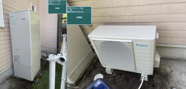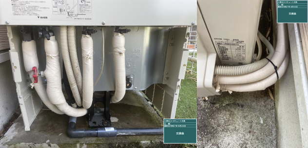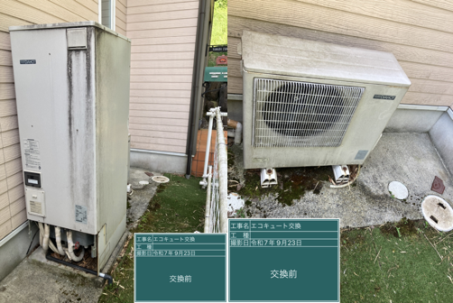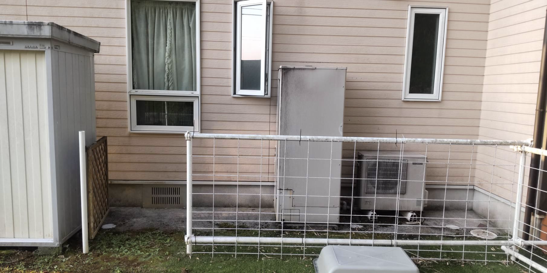 エコキュート交換工事の様子や、それにまつわるトラブル事例を紹介するこのコーナー。今回紹介するのは、静岡県賀茂郡河津町にお住まいのT様邸で行った交換工事の様子。経年劣化により故障した給湯専用タイプのエコキュートを交換した例です。転倒防止金具の取り外しも行い、コーキング処理を施しています。
