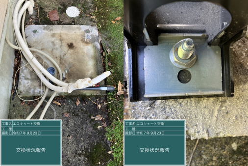 今回既設のタンクには転倒防止金具が設置されていたので、撤去してコーキング処理を行っています。現在販売されているエコキュートは、耐震性の向上とともに基礎に頼る方法で転倒防止を実現しているため転倒防止金具は不要です。