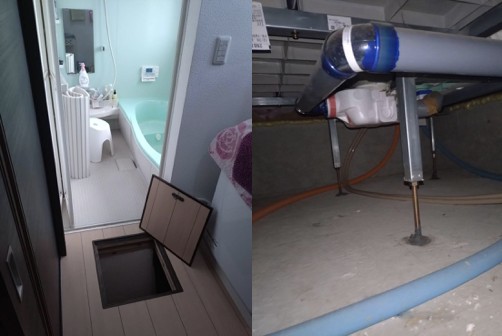 エコキュート交換工事の様子や、それにまつわるトラブル事例を紹介するこのコーナー。今回紹介するのは、宮城県遠田郡美里町にお住まいのH様邸で行った交換工事の様子。セミオートタイプのエコキュートをフルオートタイプに交換した例です。追い焚き機能を追加するため床下に入って作業を行い、ふろ配管の増設工事を行いました。