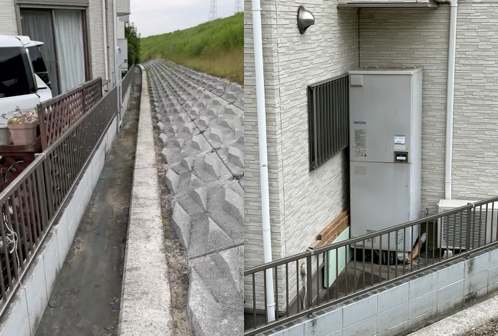 タンクがあるのは河川敷に面した家屋の裏側で、三角形のスペースにエアコンの室外機と並べて設置されていました。敷地を囲んでいるフェンスと家屋の間に通路がないため、今回は設置場所付近のフェンスを外して敷地の外からタンクの搬出入を行います。段差がある細い道を通って大きなタンクを運ぶため、慎重に作業を進めます。