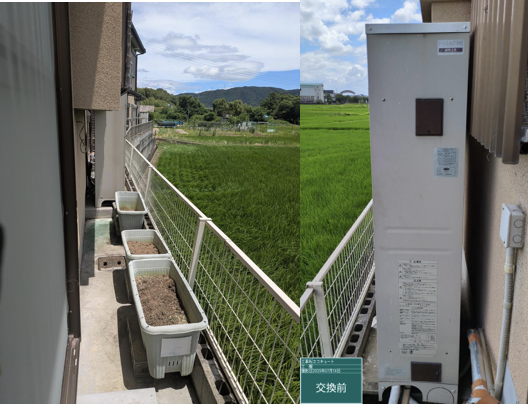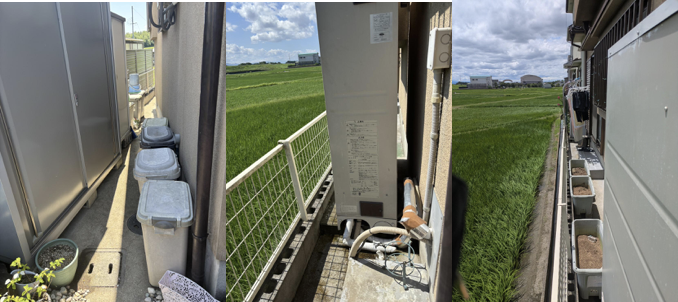 田んぼに面した家屋の裏側に、電気温水器が設置されていました。家屋周りの搬入経路は搬入口が狭いうえ、途中にある物置きや室外機などが障害物となっているためタンクを運び入れることができません。