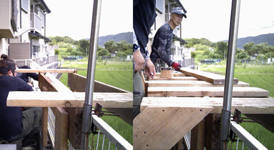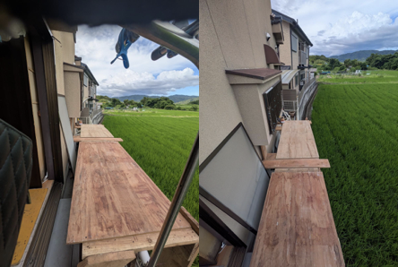 また、屋外に出る窓からタンクの設置場所までの通路途中に出窓があり、その部分はタンクを抱えて通り抜けることができません。そのため屋外ではフェンスの上に頑丈な足場を作成し、その上を通って機器を運びます。真下にある田んぼから約2.4mの高さで大きなタンクを運ぶため、ゆっくり慎重に作業を進めます。