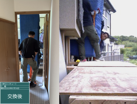 エコキュート交換工事の様子や、それにまつわるトラブル事例を紹介するこのコーナー。今回紹介するのは、京都府相楽郡精華町にお住まいのT様邸で行った交換工事の様子。宅内からタンクの搬出入を行って、経年約20年の電気温水器をエコキュートに交換しました。搬入経路を確保するため地面から約2.4mの高さに足場を作成し、その上を通って交換作業を行いました。