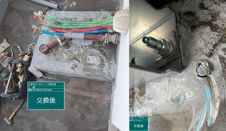 タンクは水抜きを行ってから運び出し、ヒートポンプも撤去します。基礎や配管に問題がないかどうか確認し、新しいタンクの脚位置に合わせてアンカーボルトを打ち込みます。