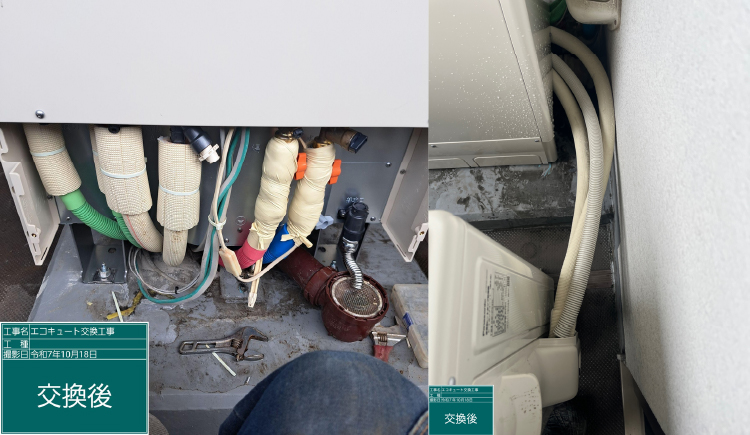 続いて新しいタンクとヒートポンプを順に運び入れ、それぞれに配管や配線を繋ぎ合わせます。勾配が小さいベランダでもタンクからの排水が適切に処理されるよう、専用の排水トラップを設置します。