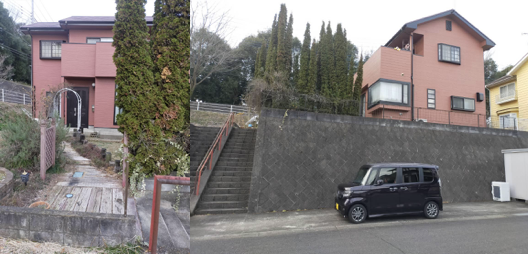 階段を昇り切ったら、玄関前から庭先を通って家屋沿いにぐるっと裏まで回ります。途中には段差や室外機などの障害物があるものの、通路幅は交換作業を行うのに充分な広さがあるので搬入経路は問題ありません。