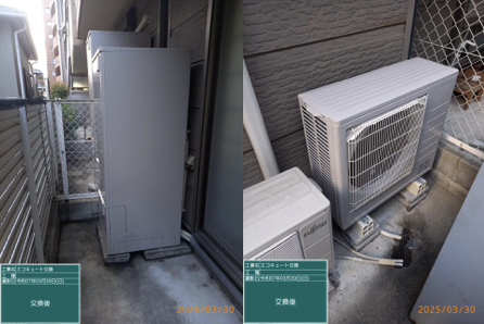 今回交換工事に訪れたのは、大阪府大阪市鶴見区。東大阪市や大東市に隣接する大阪市の東端に位置する区です。都市部へのアクセスの良さと自然豊かな住環境で子育て世代のファミリー層に人気が高いエリアです。交換工事のご依頼を頂いたA様のご自宅は、浴室が2階にある一軒家。エコキュートは家屋脇の通路に設置されていました。