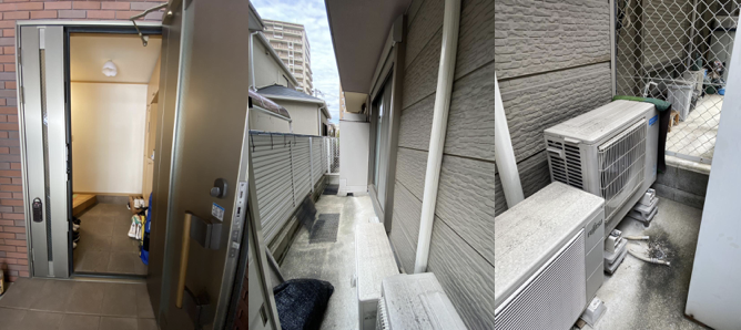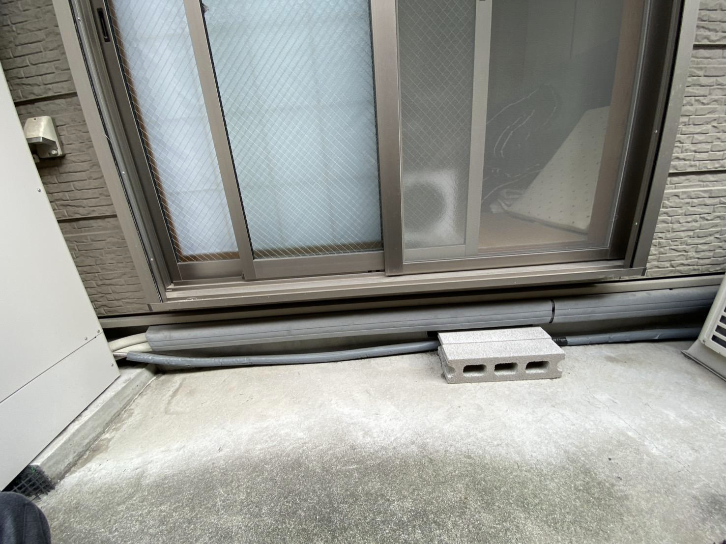 周囲をフェンスに囲まれた通路で、外側からは侵入できないようになっています。そのため今回は、設置場所の前にある和室の窓から機器の搬出入を行ってエコキュートを交換します。