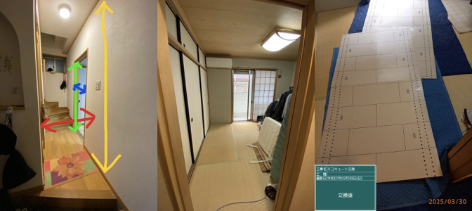 玄関から設置場所までタンクを抱えて通る経路はすべて採寸を行って、床に養生シートを敷いてから作業を進めます。